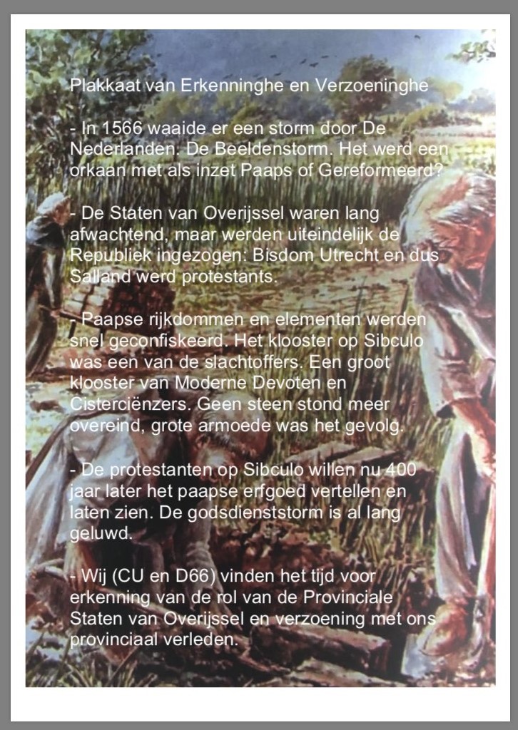 Vandaag wordt in Sibculo geprobeerd om het erfgoed van het klooster te laten herleven. In de tijd van de beeldenstorm is het klooster vernietig en geconfisqueerd door de provinciale staten van Overijssel. In de Middeleeuwen kende Sibculo een groot klooster van de Moderne Devoten en Cisterciënzers. Het klooster zorgde voor een aanzienlijke ontwikkeling van Sibculo en omgeving. De boeiende geschiedenis wordt door een lokale werkgroep weer levend gemaakt. Het kloostercomplex moet een cultuurhistorische herinnering krijgen en ook een impuls voor mensen die nu Sibculo bezoeken. Voor D66 en ChristenUnie vormde het werkbezoek om die doelstelling van harte te ondersteunen en er een pleidooi in provinciale staten aan te wijden. Jan Westert gebruikte dat momentum ook voor het benadrukken van de kracht van verbinding in de politiek. “Als het seculieren D66 en de van oorsprong protestantse ChristenUnie elkaar vinden bij een katholiek klooster zegt dat veel over het belang van verbinding in de politiek. Verbinden van mensen en bevolkingsgroepen is beter dan polariseren.”